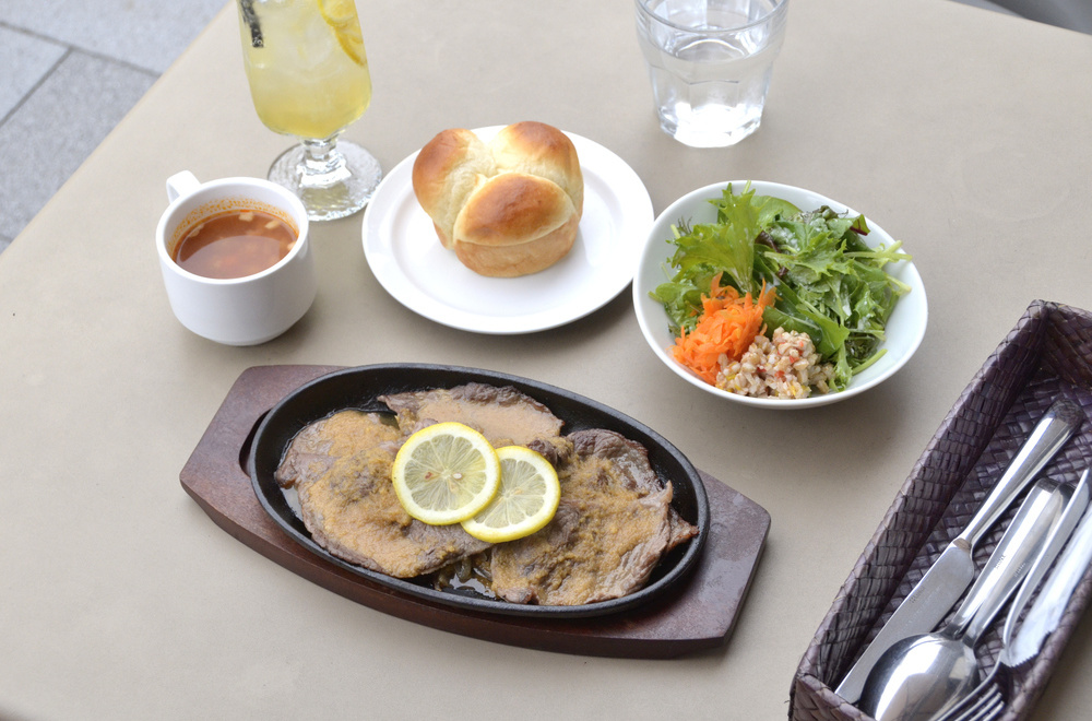 茨城産A5ランク黒毛和牛のレモンステーキ1680円。【ライスorパン付】サラダとスープは+300円でつけることができる。