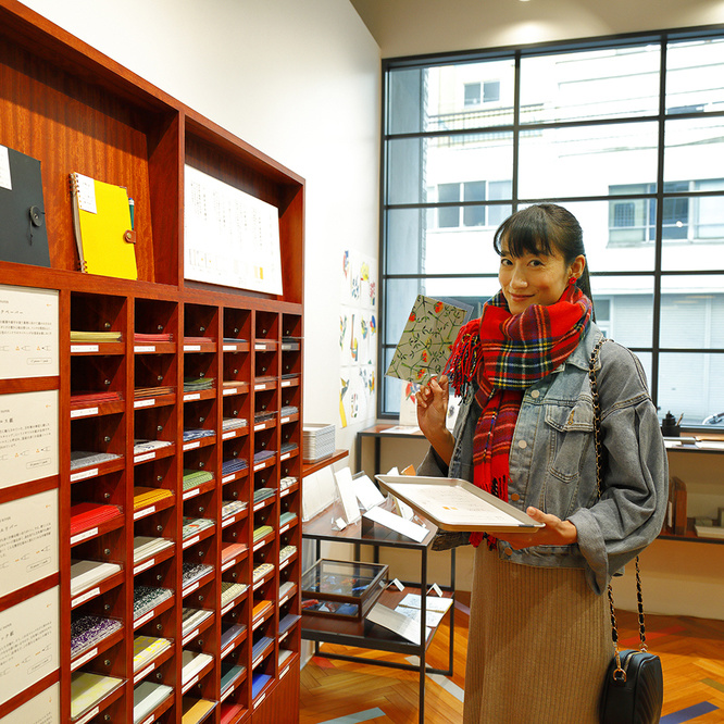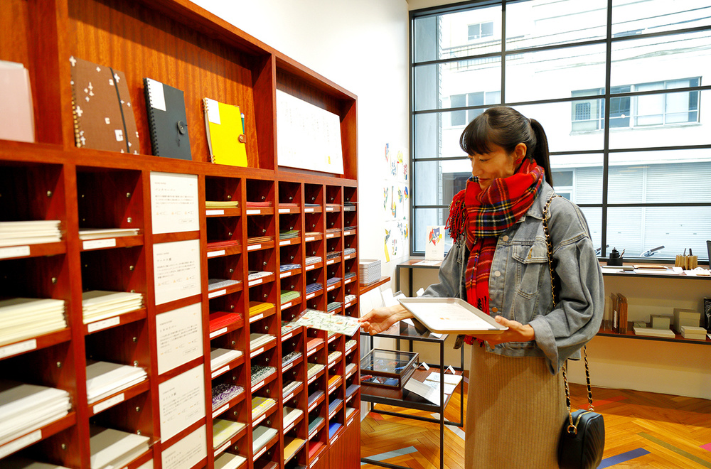 カキモリとは「書人」。書く楽しみを追求する文具店です。ここで人気なのはオリジナルノート作り。表紙、用紙、リング、留め具など好きなものを選び、自分だけのノートを作ることができます。サイズも選べ、用紙は罫のないものからスケジュール帳まで、紙の種類もさまざま。制作時間30分ほどで、製本料を入れて900円からできます。既成のノートやペンのコレクションも驚くほど豊富。安価なものから高価なものまで、万年筆は国内外のもの30種ほどをそろえ、オリジナル製品があります。広い店内を巡ると、ここの文具を使って何かを書いてみたくなります。