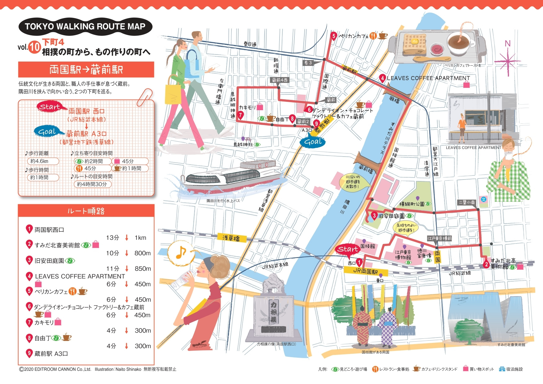 国技館を有し相撲の町として知られる両国では、美術館や庭園をめぐり、日本の美を堪能しよう。隅田川を厩橋で渡った対岸の町、蔵前は、町工場などが連なる物作りの町。近年は、おしゃれで個性的なカフェや雑貨屋が集まる。町の雰囲気が似ているNYのブルックリンに例えて、東京のブルックリンとも呼ばれる。ここでティータイムや買い物を楽しもう。趣が異なる2つの下町を結んで歩く。