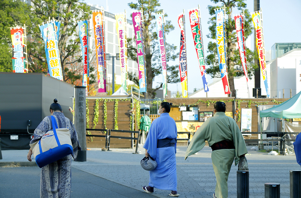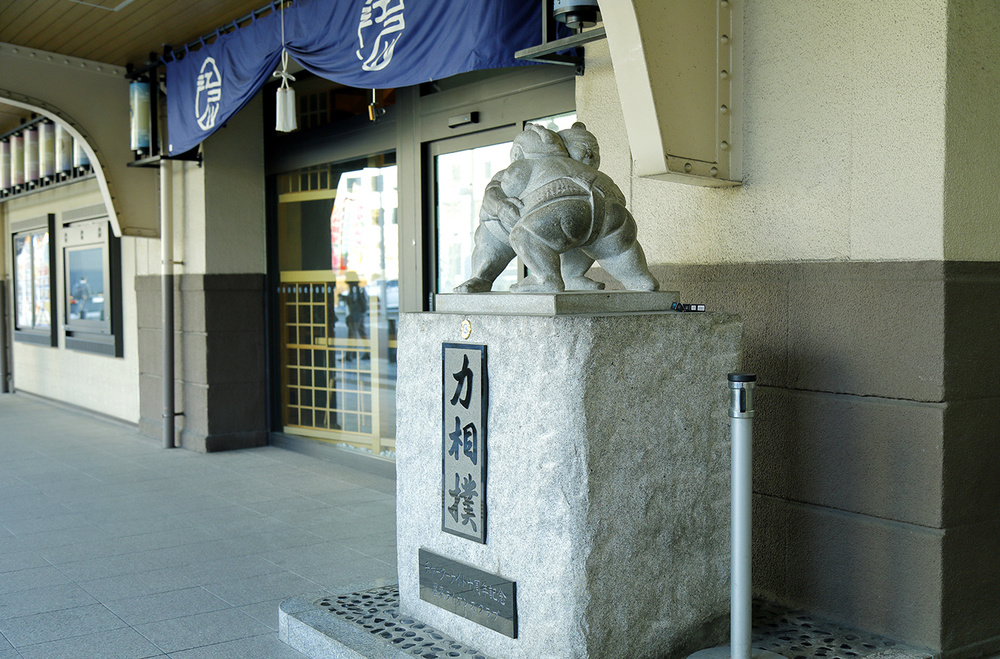 目の前が両国国技館。駅には力士の姿もよく見られる。
