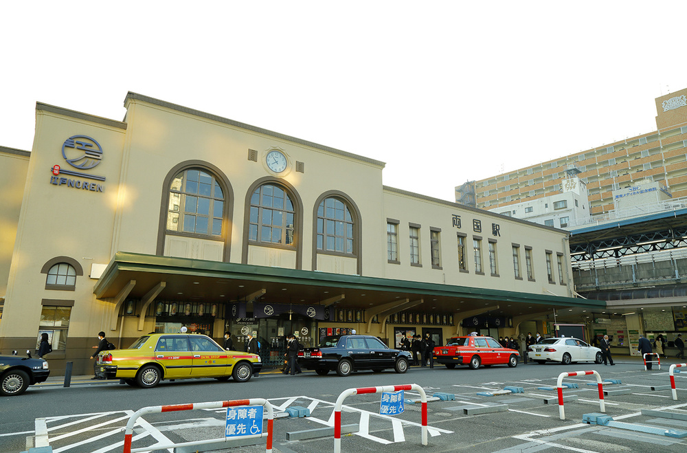 JR両国駅は、かつては両国橋という名の駅で、千葉の房総方面へのターミナル駅としてたいへんにぎわいました。1972(昭和47)年に総武本線の東京~錦糸町が開通するとターミナル駅としての機能を失いました。1929(昭和4 )年に建てられたモダンな旧駅舎は、現在江戸NORENという飲食店街として整備され、江戸の食文化を発信する和食店が軒を連ねています。都営大江戸線両国駅は、JR両国駅から少し離れており、連絡はしていません。