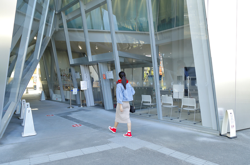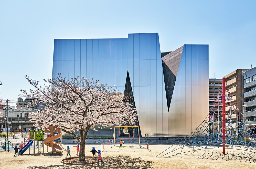 柔らかな鏡面に大きくスリットが入った独特の建築が印象的。