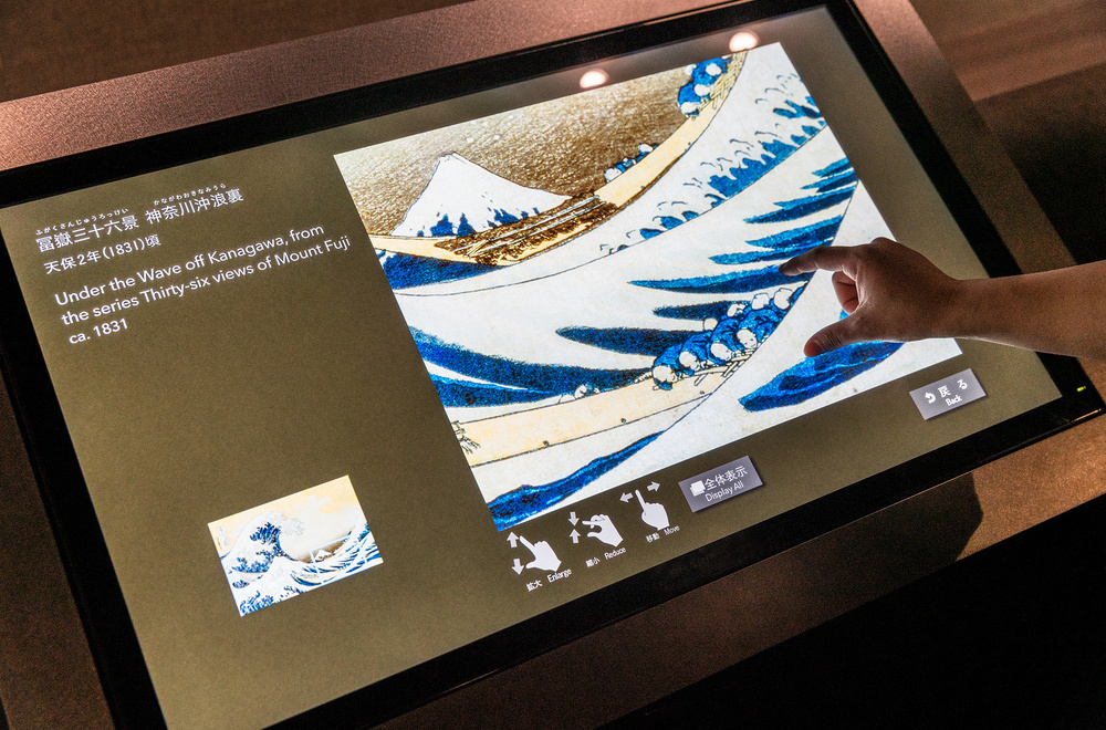 タッチパネルで作品をズームアップして鑑賞することもできる。『北斎漫画』の絵手本もタッチパネルで紹介している。