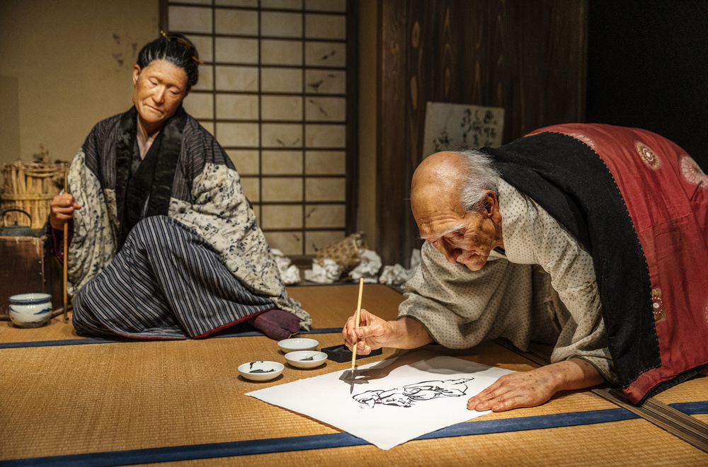 娘お栄(葛飾応為)とともに制作にあたった北斎のアトリエ(住居)の再現模型。生涯に90回以上引っ越しをしたといわれるが、そのほとんどはすみだであった。