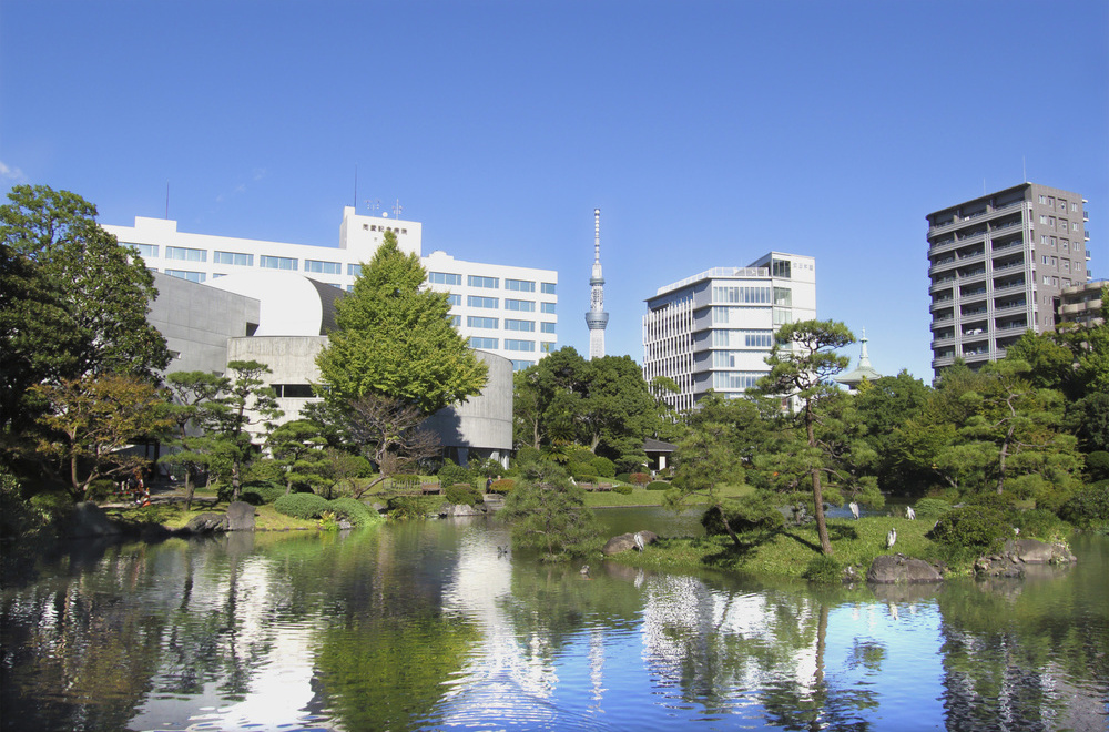 心字池の向こうには、近代的なビルやスカイツリーがそびえる。(墨田区観光協会)