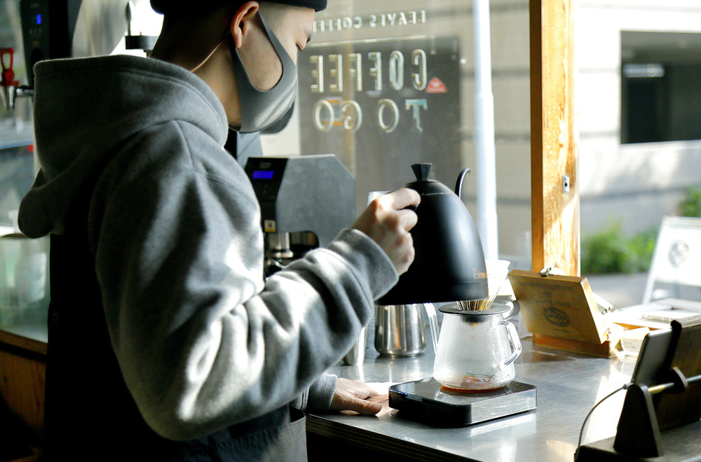 スタッフの田中航太さん。種類により一番おいしい状態で丁寧に抽出。客の好みにも応える。
