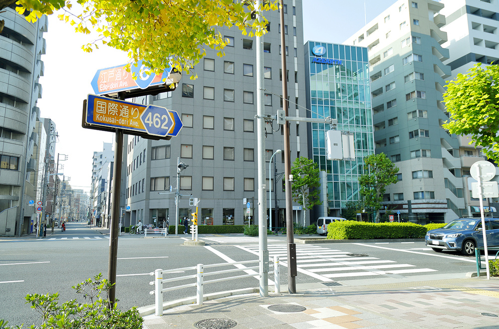 蔵前二丁目の交差点は、国際通りと江戸通りが鋭角に交差する。