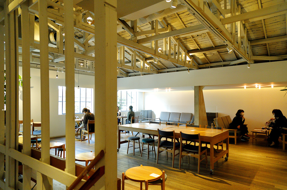 2階のカフェは古さや倉庫らしさも生かした落ち着く空間。