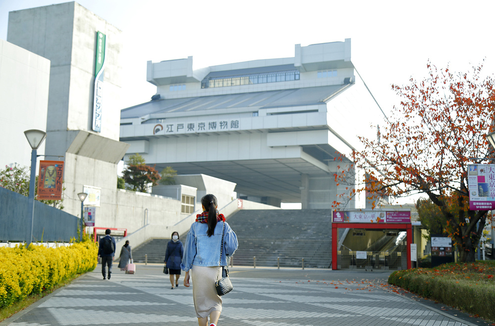 両国駅西口前を右折すると江戸東京博物館の壮大な屋根が見える。