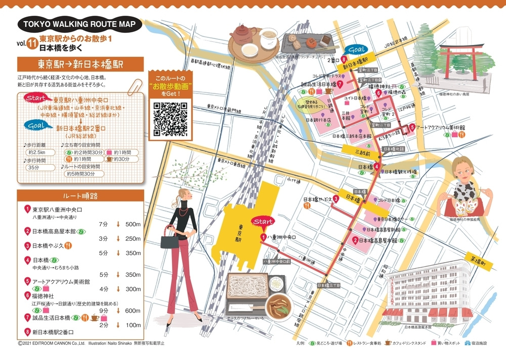 首都東京の玄関駅、東京駅をスタートし、日本橋を巡る。日本銀行や日本橋三越、三井本館など日本の金融・経済をけん引してきた豪壮な建物が残る町並みは、独特の威光と活気に満ちている。江戸時代から商人文化・町人文化の中心として栄え、有名な老舗や寺社がビルの間に残る。近年は再開発により大型商業施設や、金魚の水族館などの新スポットも続々登場。新しい日本橋の魅力を発信している。