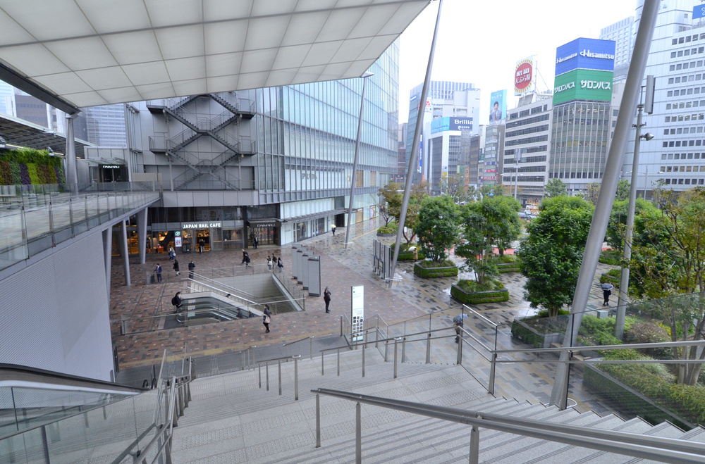 八重洲口の南北を帆のような形の大屋根「グランルーフ」が覆い、緑豊かで雨でも歩ける歩行者空間を作り出している。