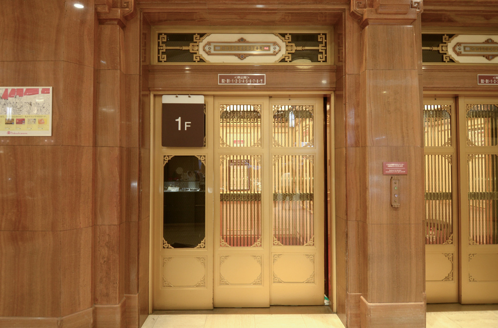 木目のような大理石の壁が美しいエレベーターホール。現在も案内係が手動で操作している。