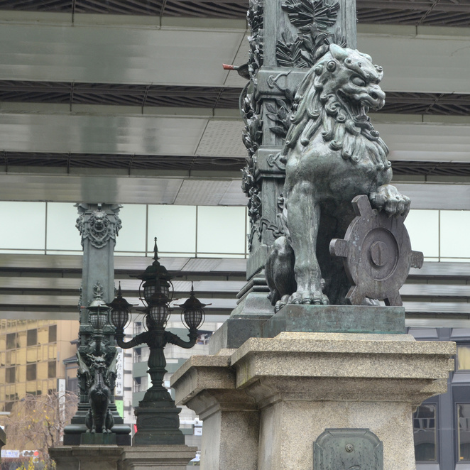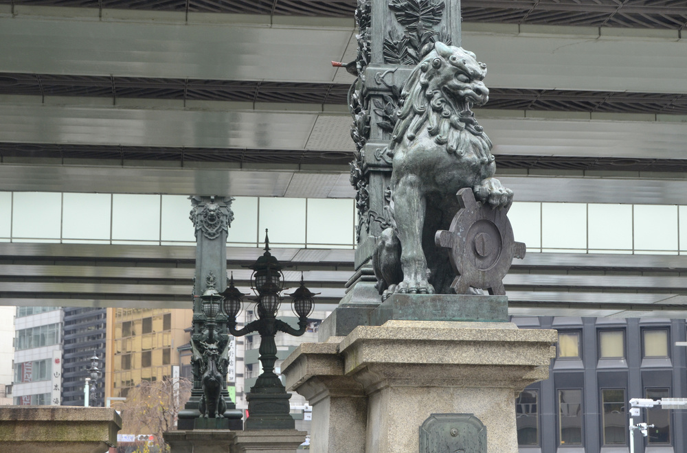 四隅や橋柱には、東京市の繁栄を表す麒麟や、守護を表す獅子のブロンズ像が据えられている。