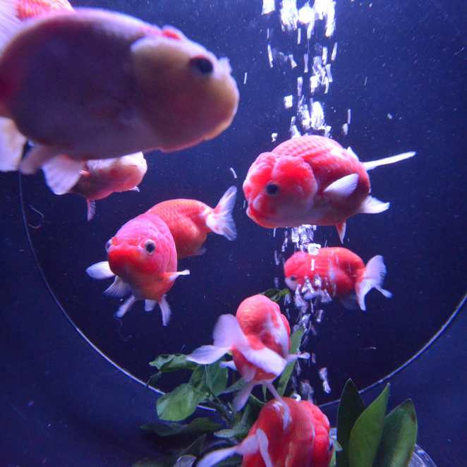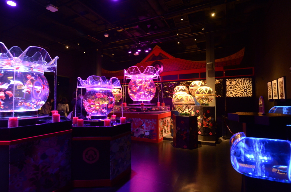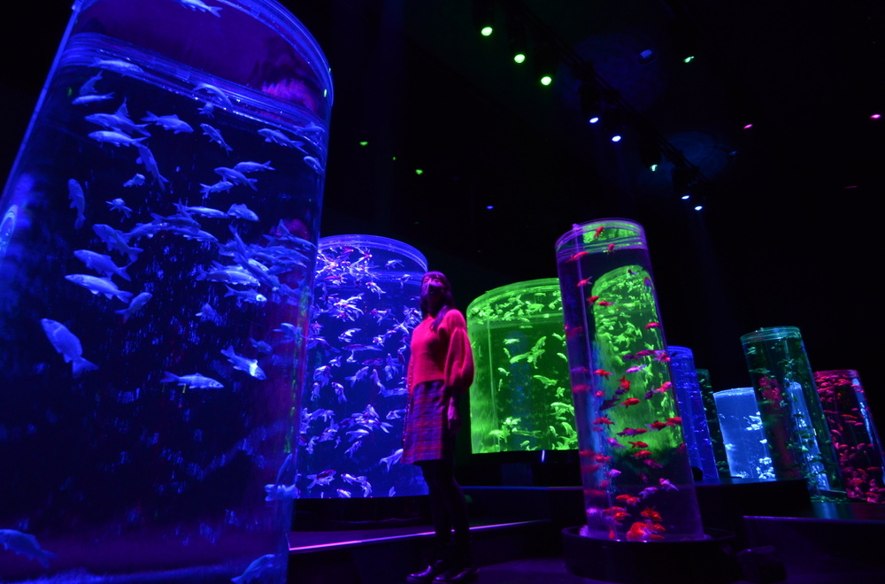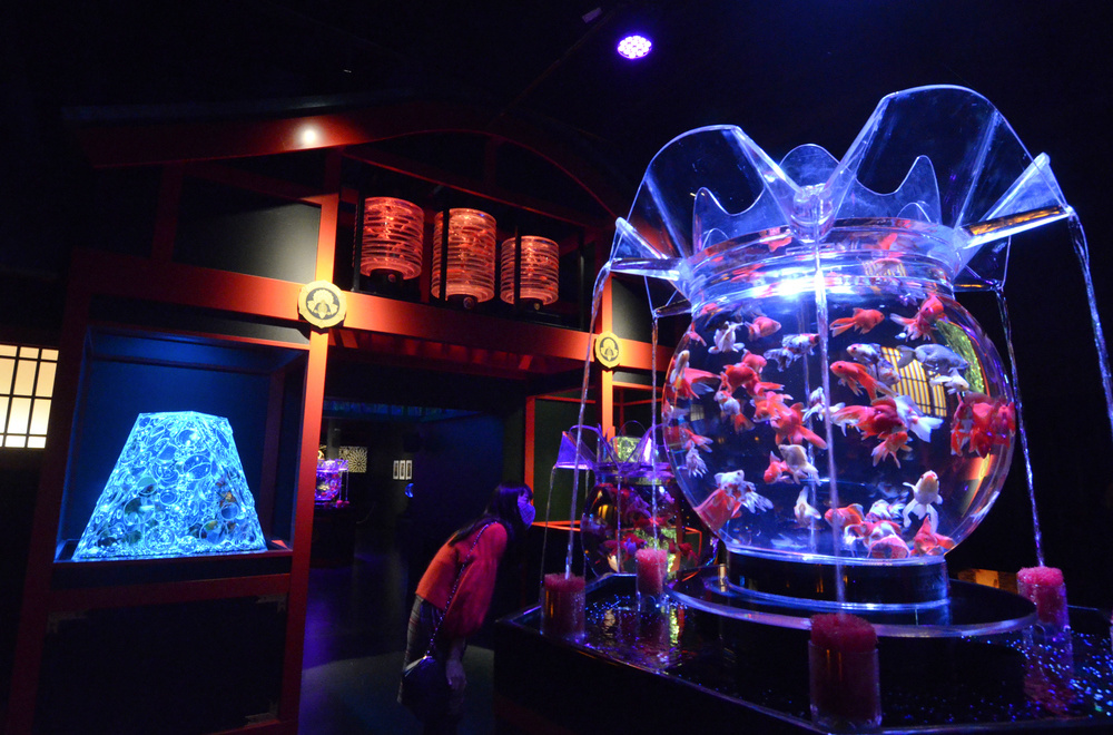 自分の背丈よりも大きな水槽が林立する「金魚の杜」。まるで自分も水中にいるような感覚になる。