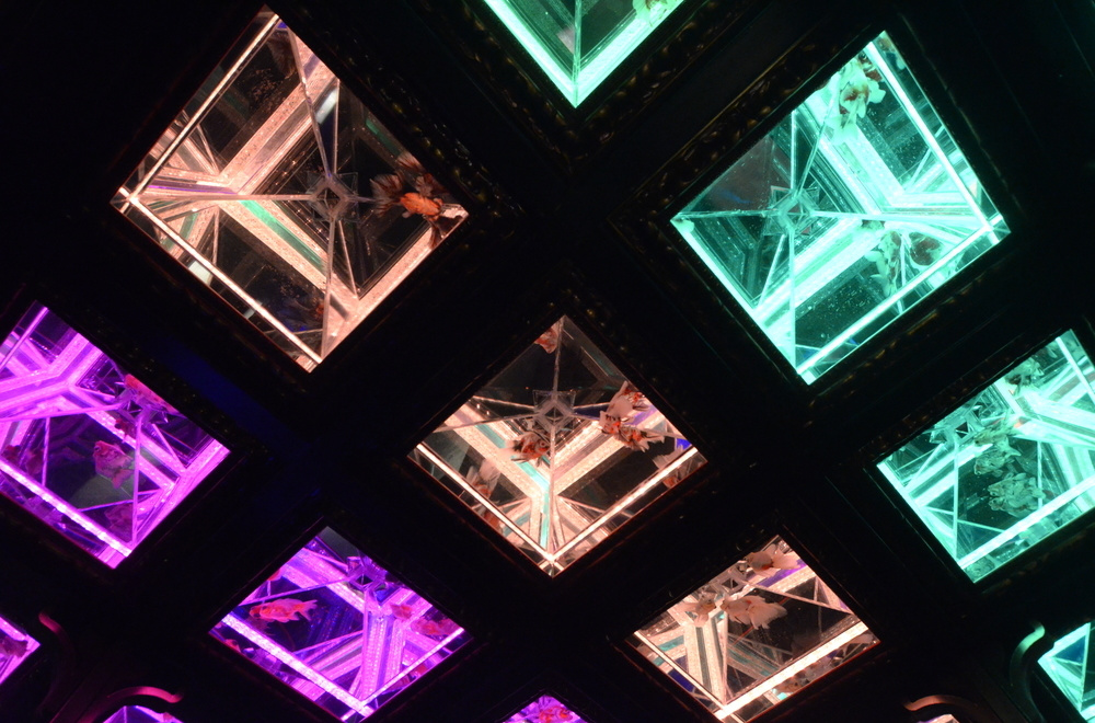 格天井をイメージした天井のひとつひとつにも金魚が泳いでいる。