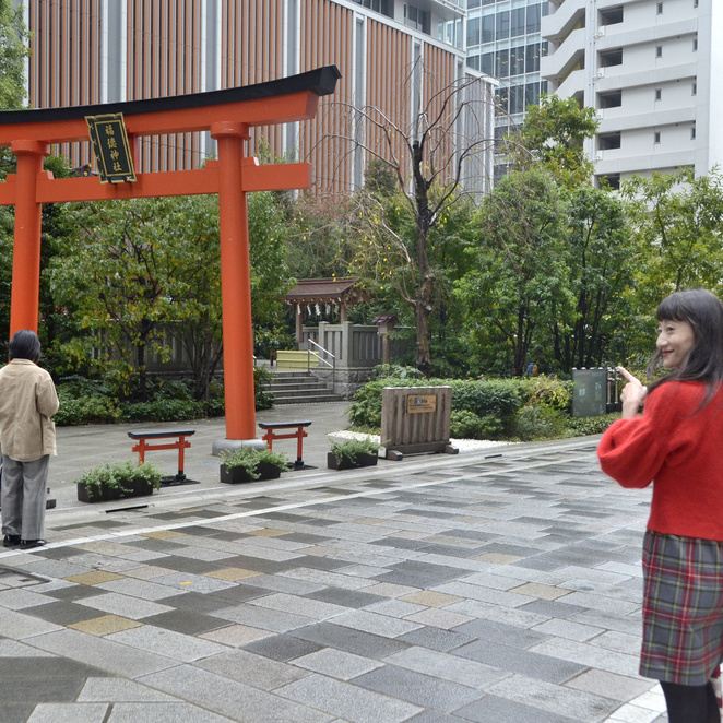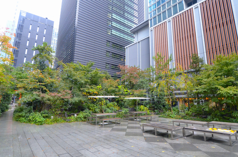 神社に隣接した福徳の森は、1000㎡もの広場で、四季の変化が美しい木々に囲まれています。ベンチやピクニックテーブルもあり、お天気のいい日にはそれぞれにくつろぐ人たちの姿が見られます。再開発が進むこの地の、ビルの間にぽっかり開けた憩いの場。イベントにもたびたび利用されています。