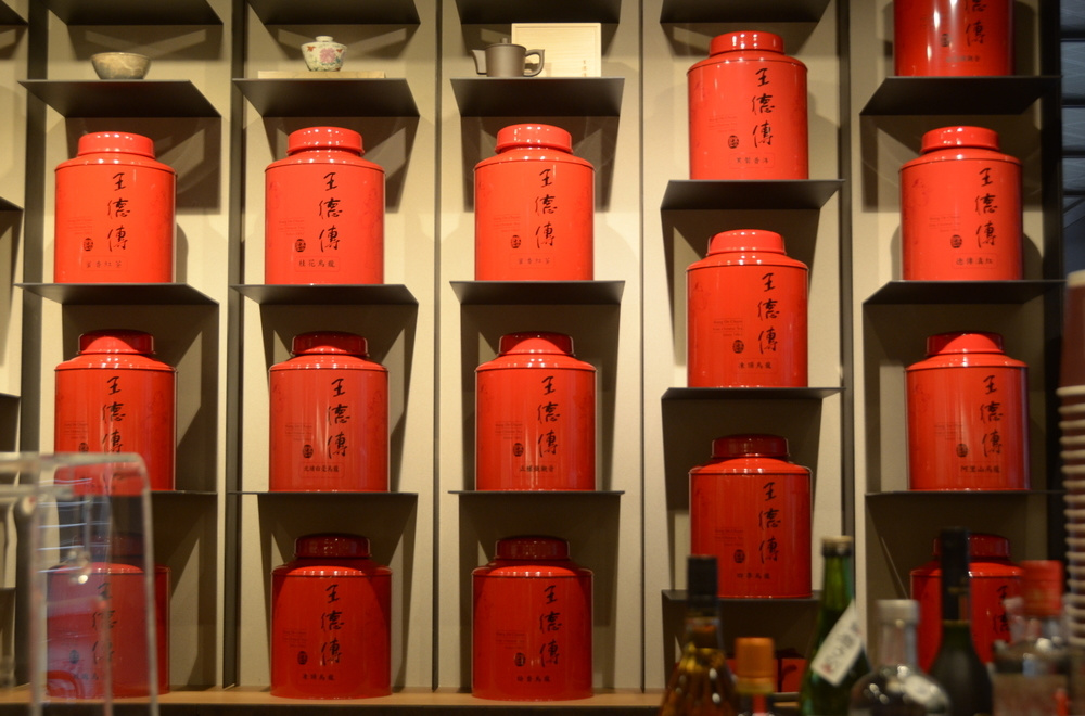 王德傳(Wang De Chuanに)は約50種ある茶筒が並び、厳選した茶葉が入っている。