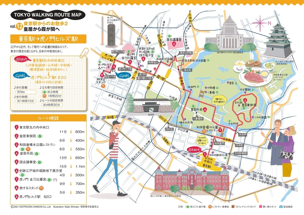 明治時代を彷彿させる赤レンガ造りの丸の内駅舎からスタートし、かつて江戸城が存在していた皇居東御苑、二重橋や桜田門のある皇居外苑へ。歴史の流れを感じるとともに、都会の真ん中とは思えない美しい自然を楽しもう。この周辺はさまざまな行政機関が集まる、まさに日本の中枢となる地。独特な雰囲気がある官庁街から、さまざまなビルが建ち並ぶオフィス街の虎ノ門へと歩く。