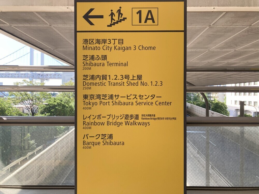 芝浦ふ頭駅の改札は一つ。1A出口の階段を降りたら南に進み、高速道路の下を歩くこと約6分。左手にレインボーブリッジの遊歩道入口の看板が見えてきます。