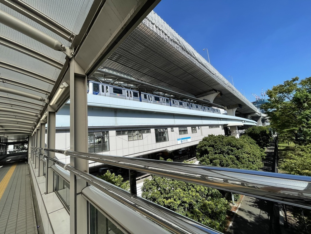 階段から見る芝浦ふ頭駅。周囲はビルや倉庫が立ち並び、日中の人通りは多くない。