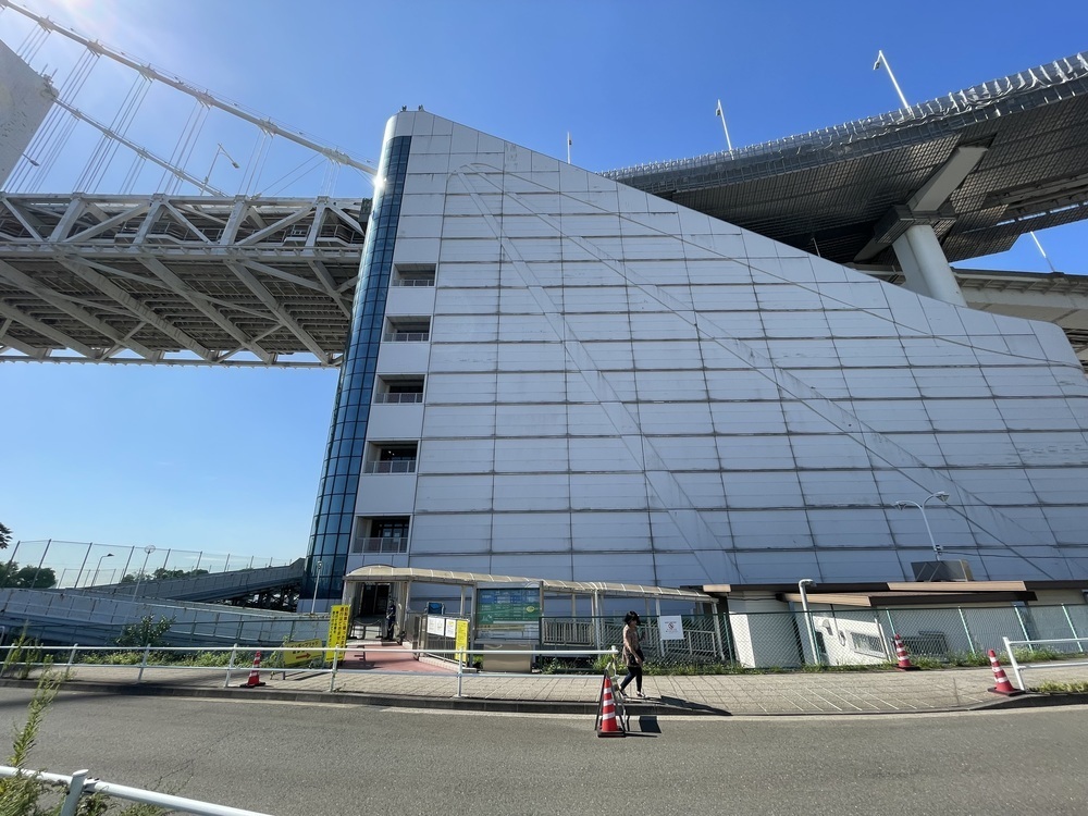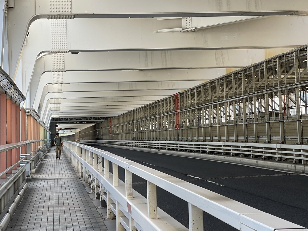 吊り橋を内側から体感! ケーブルをピンと張って立ち上がる2つの塔と垂直の橋桁。間近で見るレインボーブリッジは迫力満点。橋桁の高さは52m、ビル20階に相当する高さを歩くのは貴重な体験で、頭上の高速道路の振動をそれなりに感じるのも首都の交通網を支える橋を歩く実感が。中に入ったからこそわかる橋のすごさをぜひ体験してみて。 |