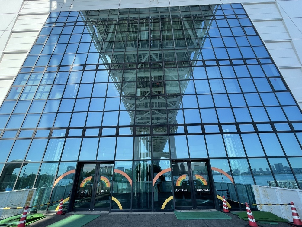芝浦アンカレイジ入口。映りこんだ橋桁が迫力あるおすすめの撮影スポット。