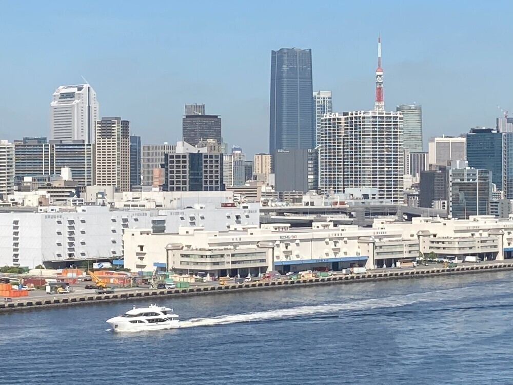 水上を行き来する船と芝浦や田町のビル群、背後で頭を見せるのは東京タワー。