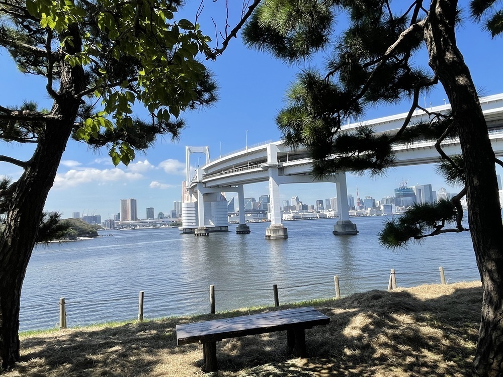 橋のスロープ部分を支える橋脚が迫力。松の木との取り合わせも妙味のあるレインボーブリッジの隠れたビュースポット。