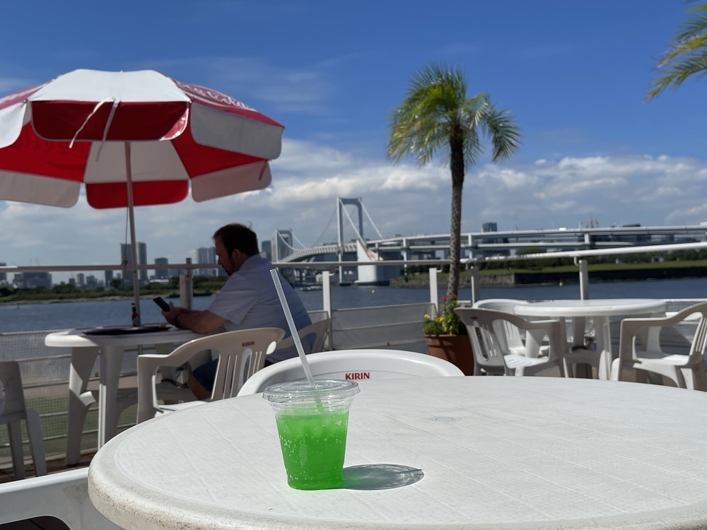 お台場海浜公園のビーチサイドにあるカフェ。テラス席でドリンクやスナック、軽食が楽しめます。ソフトクリーム400円、メロンソーダ300円、ビール400円~など。