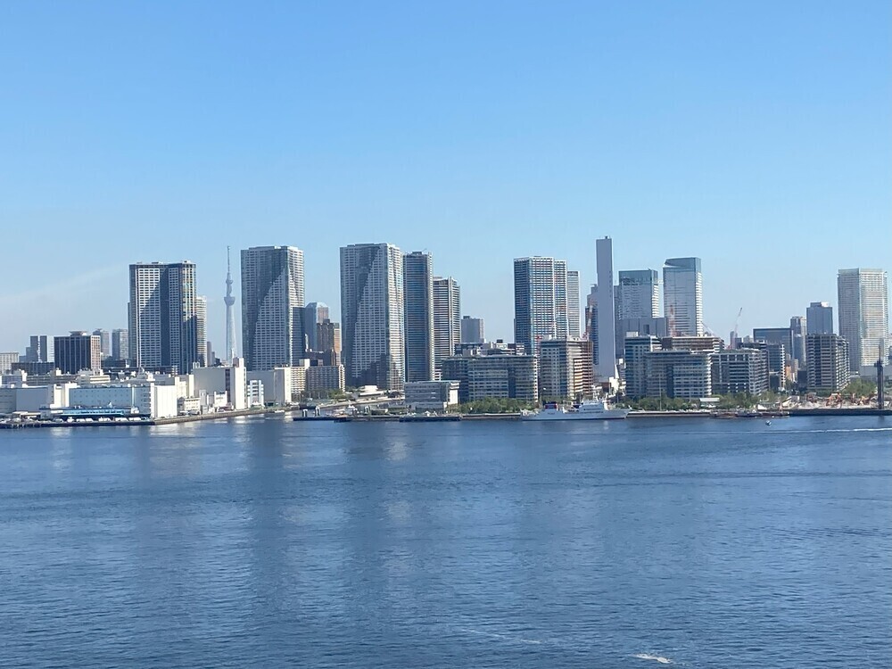竹芝~晴海のふ頭を見渡す。林立する高層ビルの奥に東京スカイツリーが見える。