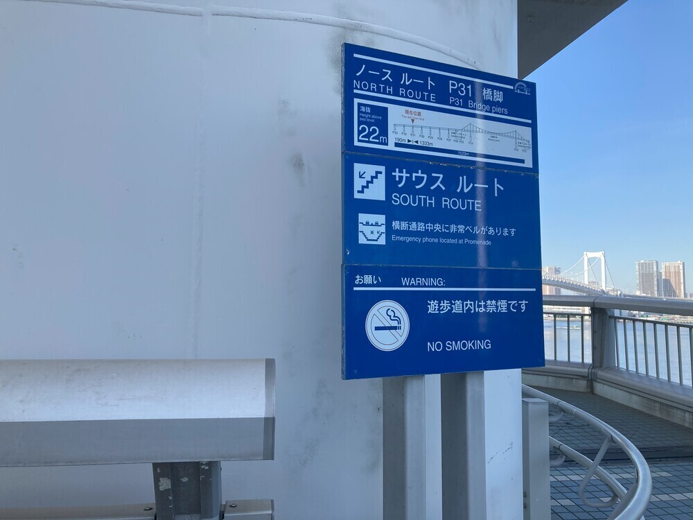 アンカレイジとは、吊り橋を支えるメインケーブルを固定する巨大なコンクリートブロックのことで、橋の両側に設置されています。芝浦側のアンカレイジは遊歩道への入口となっており、エレベーターで橋桁の位置まで上がります。遊歩道は都心側を眺められるノースルートとお台場側に視界が開けるサウスルートがあり、今回はノースルートを選択しました。ルートによってエレベーターが異なるので乗る前に表示を必ずチェック。遊歩道はゆっくり歩いて30分くらい。お台場側に着くまでトイレはないのでここで立ち寄りましょう。ドリンクの自動販売機もあるので水分の調達もここで。