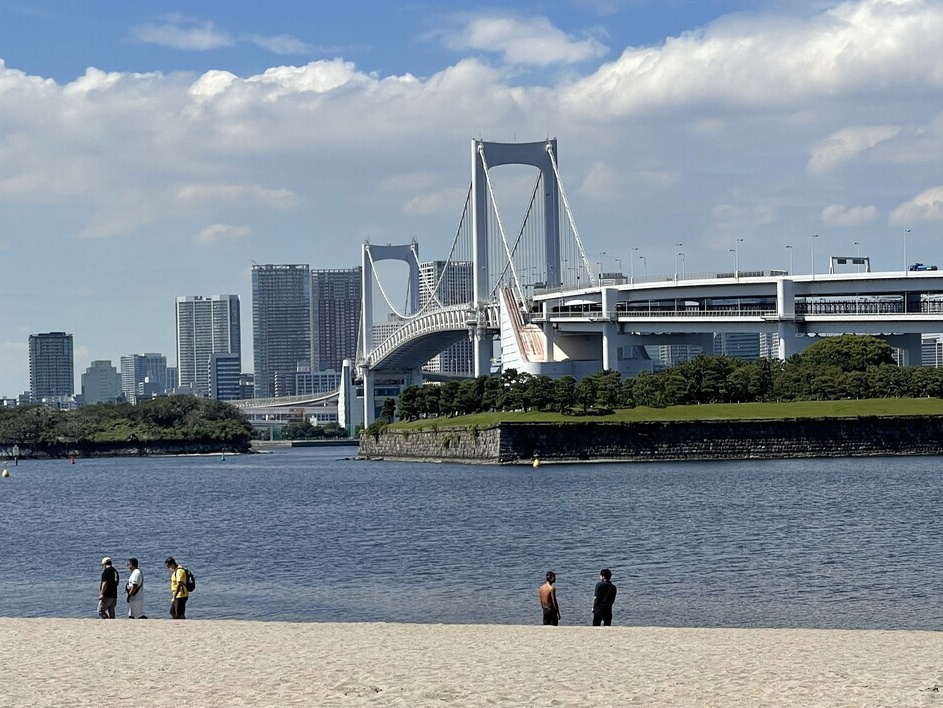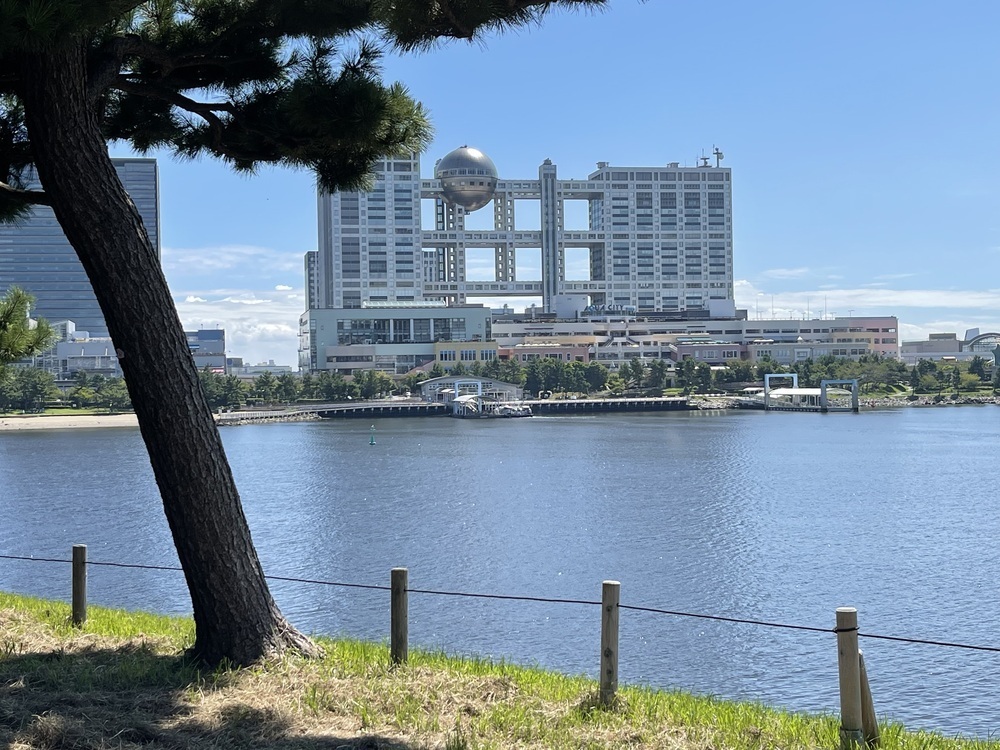 公園の土手から眺めるお台場ビーチとフジテレビ本社。心が洗われる水辺の景観をゆっくり楽しもう。