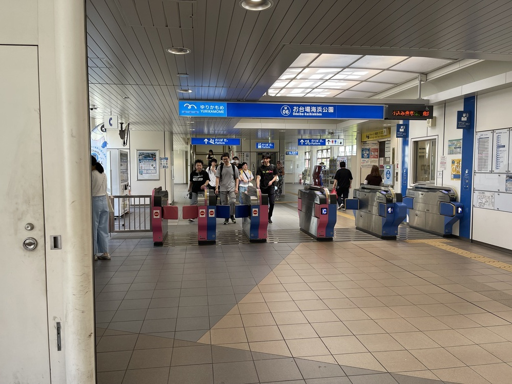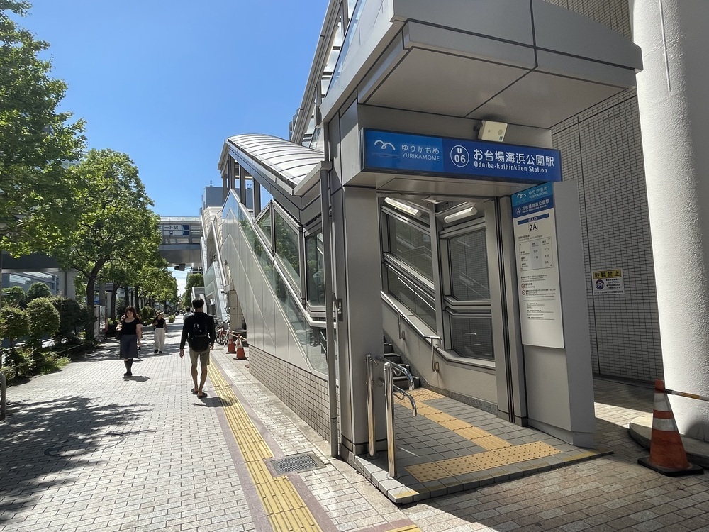 お台場海浜公園中央デッキを出て道路を渡り、直進。交番前を左折すると2C・2A出口があります。連絡通路でマルエツお台場店と直結するなど利便性も高い駅です。