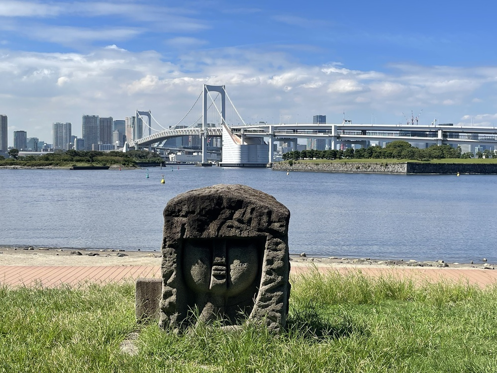 公園中央部にある「新島のモヤイ像」。イースター島の「モアイ像」を元に、東京都新島に伝わる「もやい」(絆)の精神を込めている。