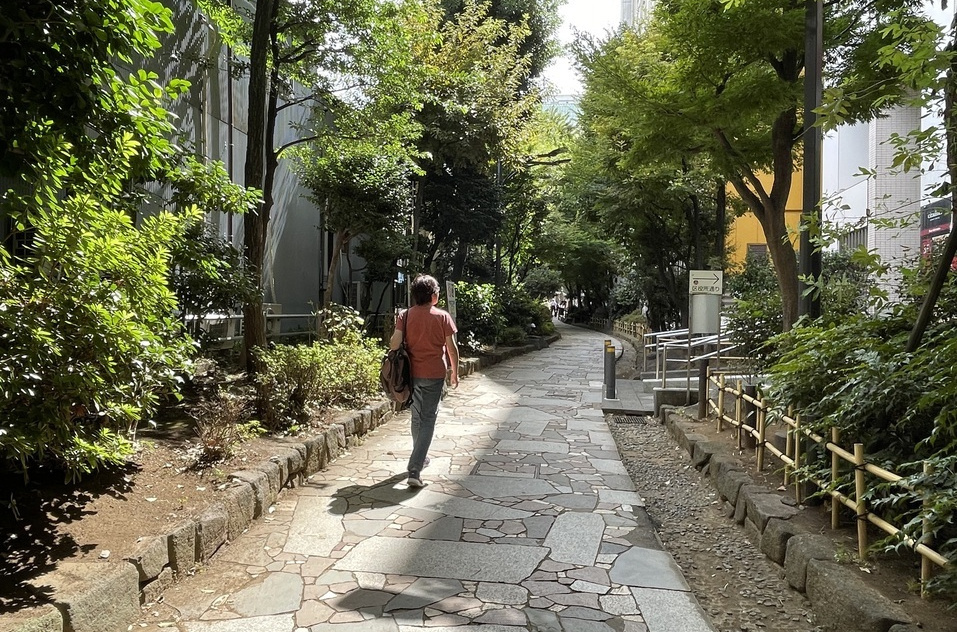 緑と石畳の遊歩道は繁華街のオアシス的存在。