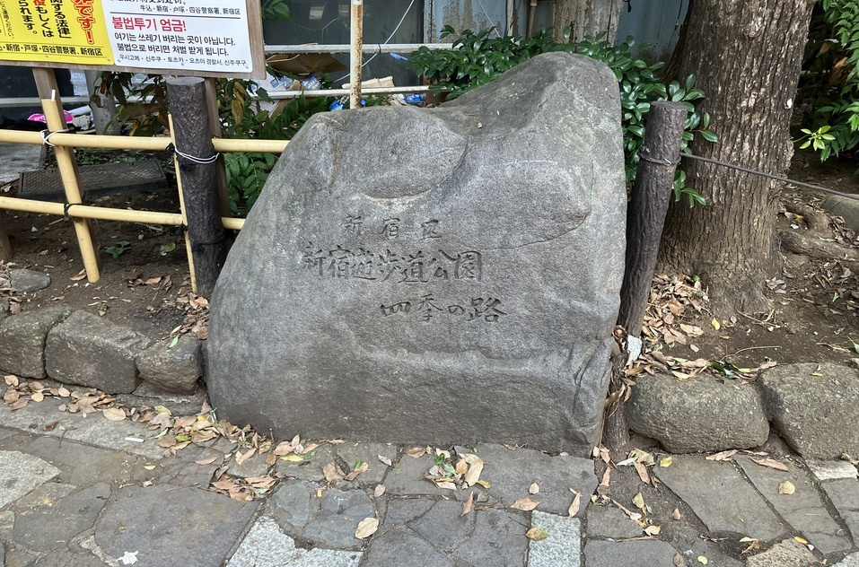 遊歩道にある石碑。隣に新宿ゴールデン街が広がる。