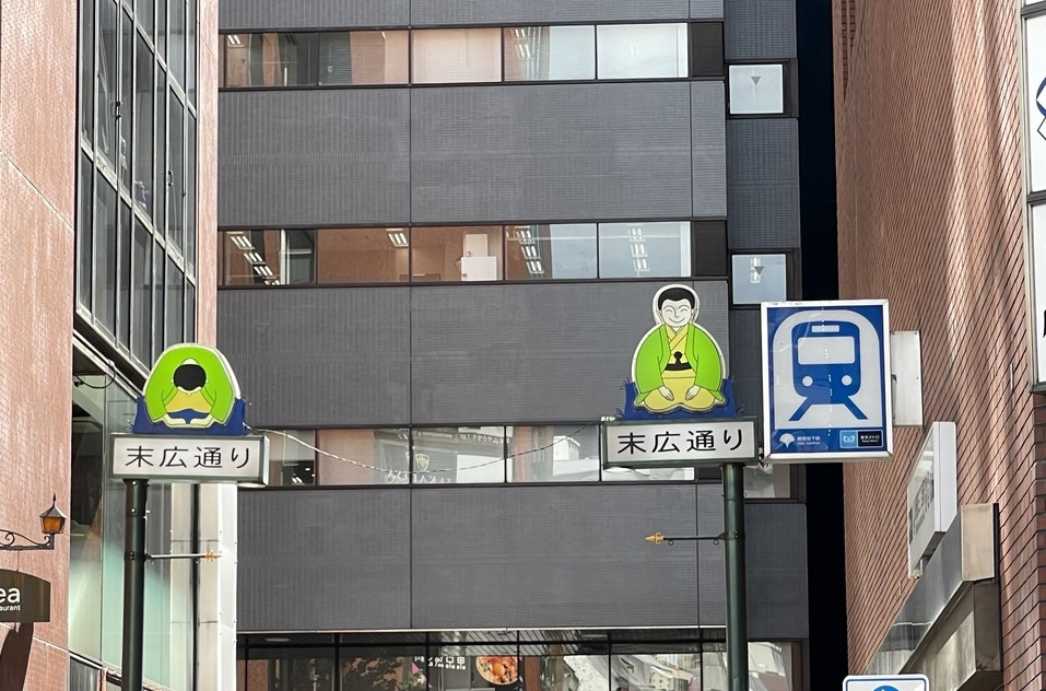 落語家イラスト看板のすぐ横が地下鉄出入口。
