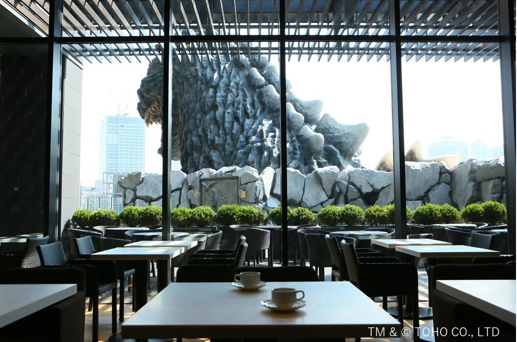 新宿東宝ビル8階、ホテルグレイスリー新宿のロビーにあるカフェラウンジ。ゴジラヘッドを間近で見ながら、コーヒーやアルコールを味わえます。