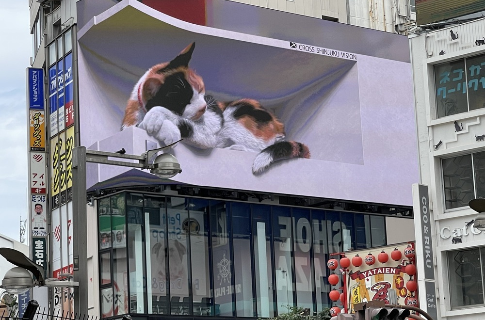 2年前にお目見えして以来、新たな新宿名所となっているのが、このクロス新宿ビジョンの巨大な猫です。3D映像でビジョンから飛び出して見える不思議な三毛猫は、猫好きならずとも胸がキュンとなるほどの可愛らしさ。広告の合間に登場し、行き交う人々を魅了しています。この猫を見るベストポジションは、新宿東口駅前広場の木の下あたり。ビジョン放映時間は7時から翌1時です。