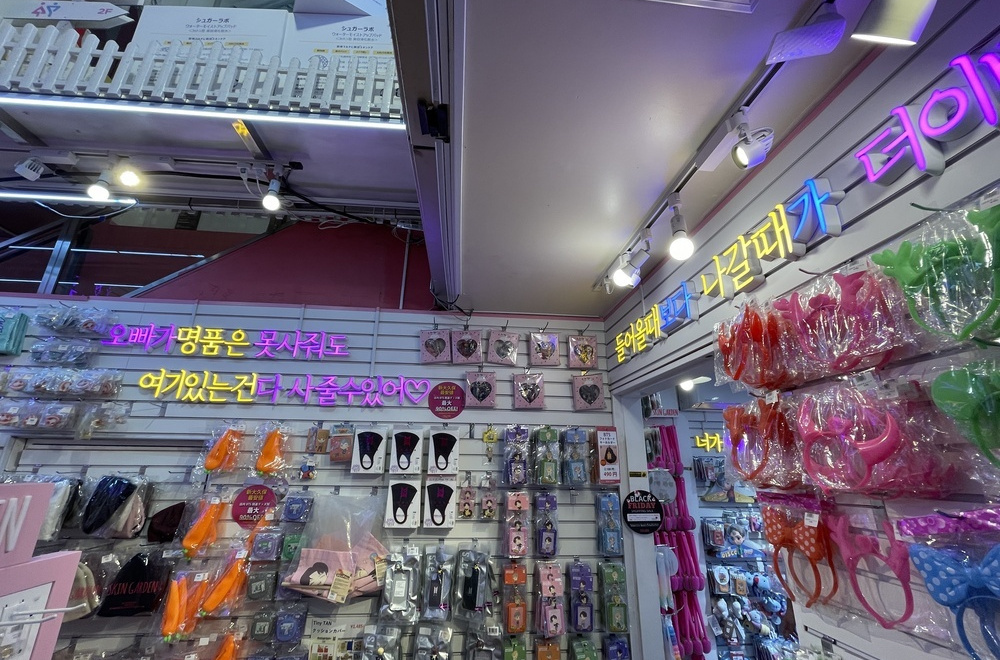 ピンクの看板に韓国コスメの写真が目印。