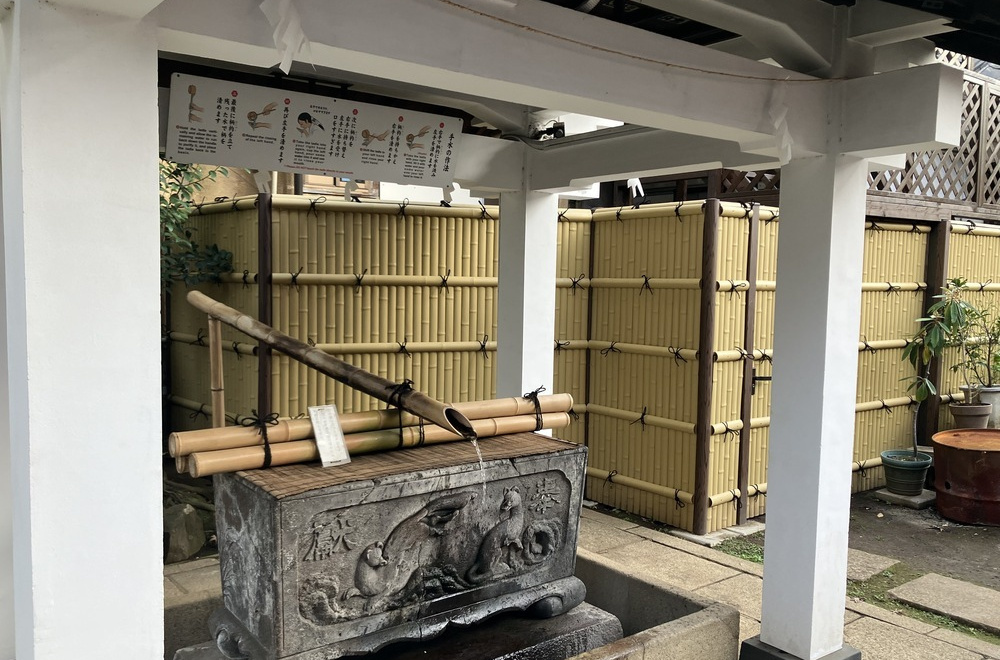 手水舎は竹の筒から常に水が流れる仕組みに。