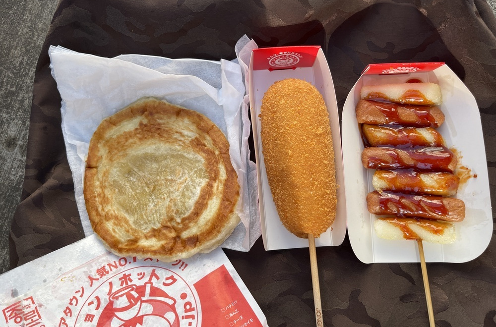 左から、さつまいもホットク400円、チーズ米ハットグ450円、ソトックソトック400円。
