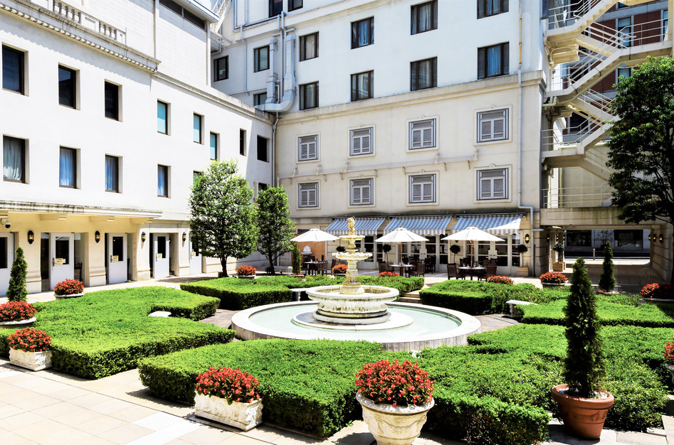 幾何学的な植え込みの中央に噴水を配した本館のパティオ。
