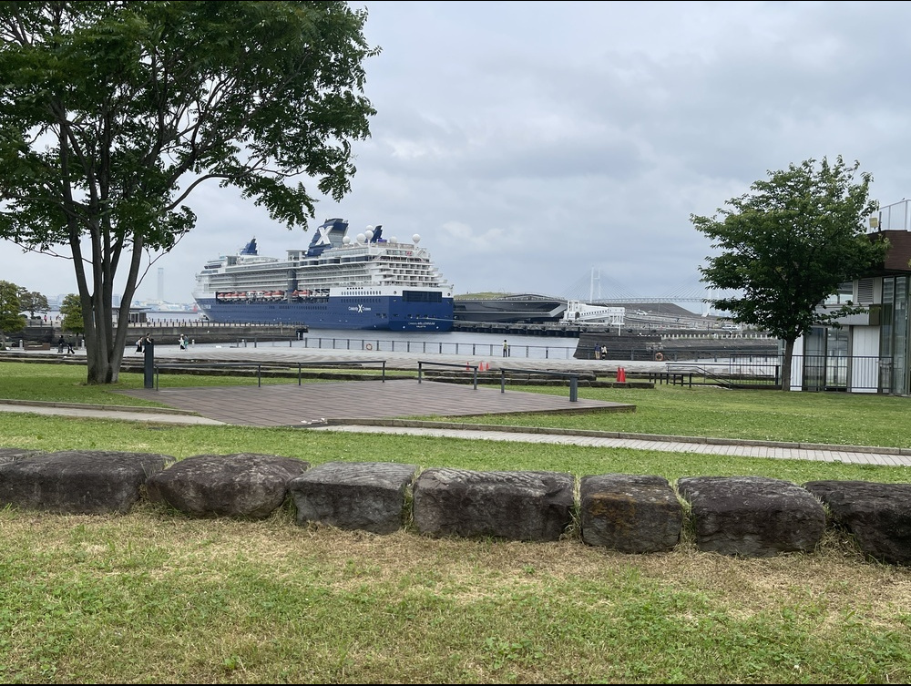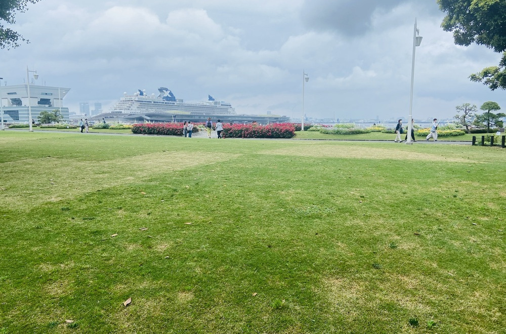 広い芝生の広場。この日は停泊中の豪華客船も間近に。