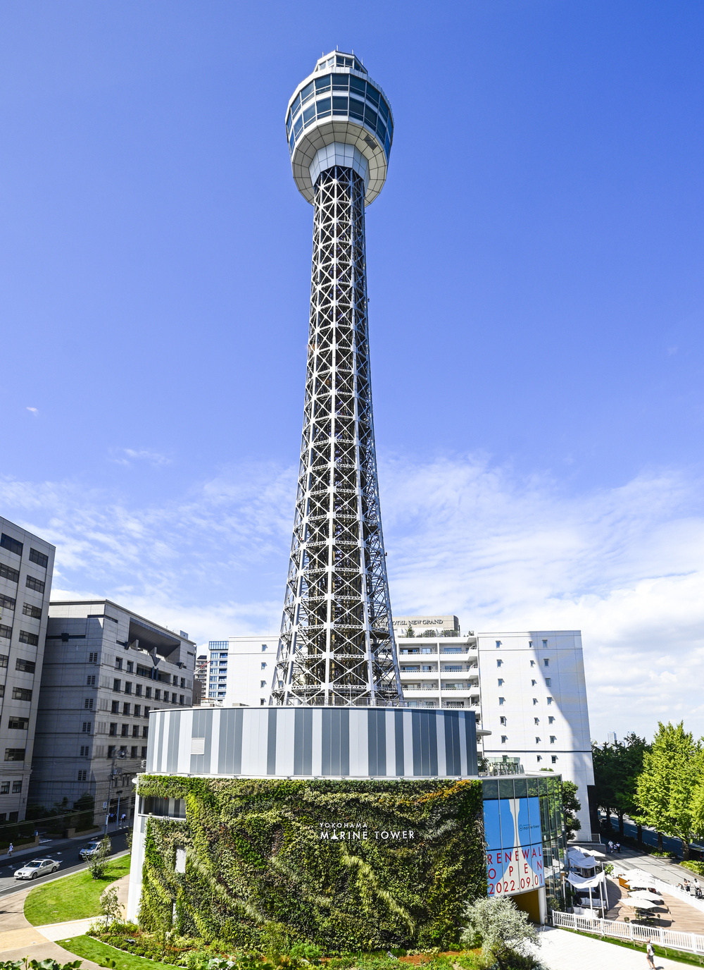 1961年の開業当時は日本で最も高い灯台として機能した展望台でした。ガラス張りのエレベーターで高さ94mと91mの2層の展望フロアへ到着すると横浜一帯が一望でき、気象条件によっては富士山や房総半島が望めます。2022年のリニューアルで、アート展示スペースや横浜ゆかりの書籍などが揃うラウンジが誕生。街や人と触れ合えるオープンな空間で過ごし方もより自在に。緑化された壁面が印象的な低層階には人気のカフェやレストランも。
