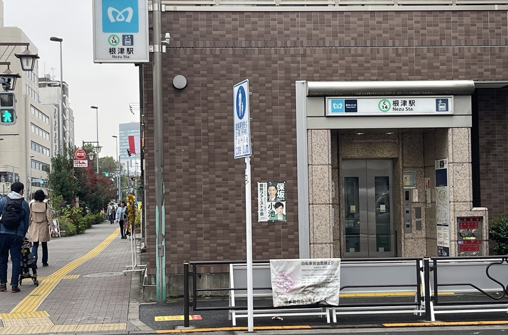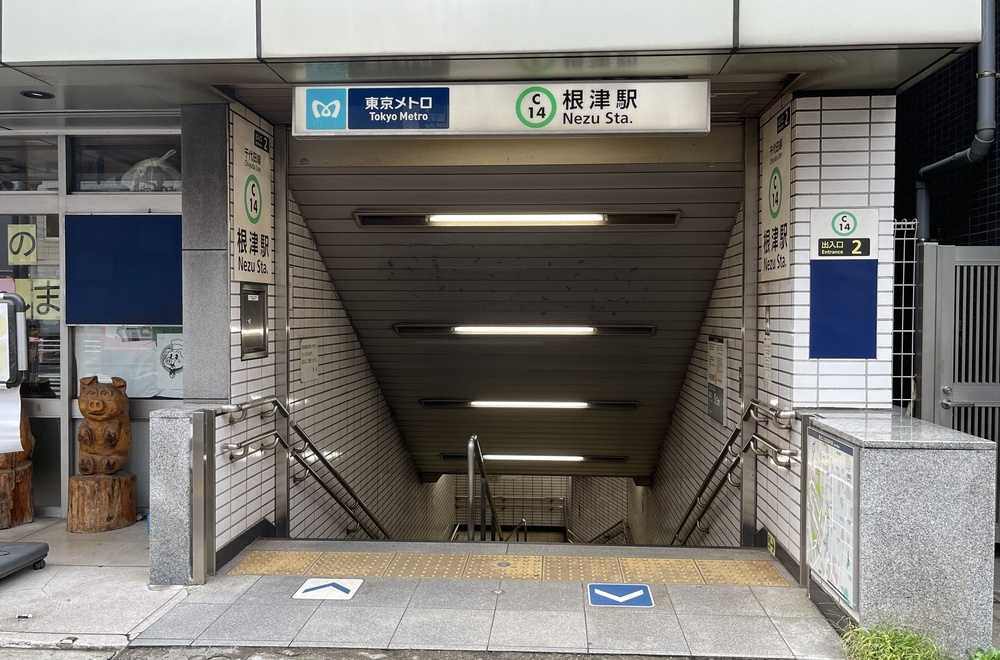 東博を背に道を進み、東京藝大のキャンパスや施設を左右に見ながら、住宅街の道を何度も曲がりながら、不忍通りに出て、通りを渡ると根津駅の入口が見えてきます。