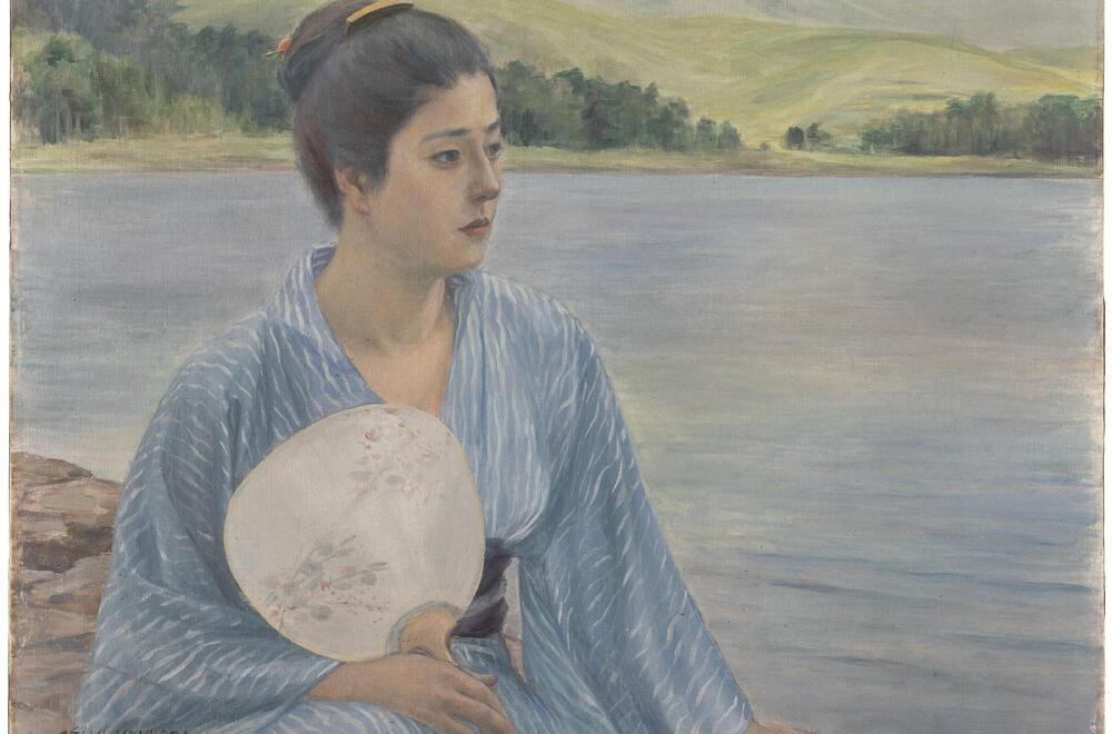 箱根芦ノ湖畔で描かれた作品。浴衣の色柄、女性の静かな表情が湖水と重なるかのよう。切手の図案にもなり、黒田の作品でも特に知名度が高い。