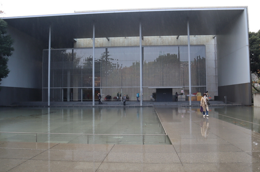 ガラスや格子、石壁を用いたモダンな建物は美術館建築を多く手がける谷口吉生氏の設計。石貼りの通路と水盤で構成されたアプローチを進み、宝物館へ。
