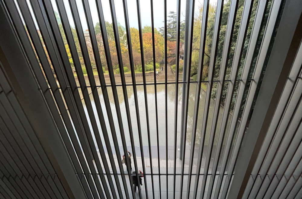2階通路の縦格子からの眺め。鑑賞の合間に緑と水、光の空間が楽しめる。