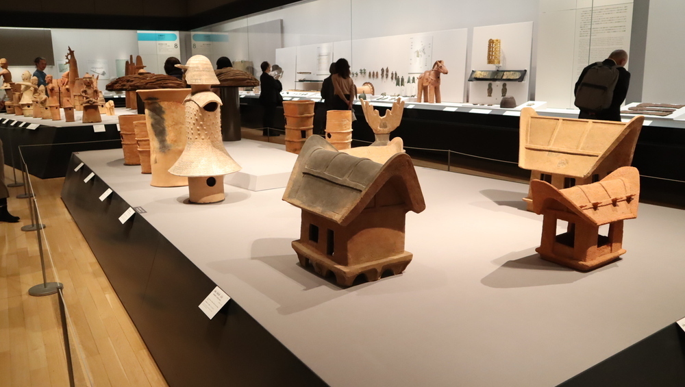広いフロアにさまざまな考古資料を展示。周囲の展示ケース、フロア中央で展開する埴輪、どこから見ても楽しめる。